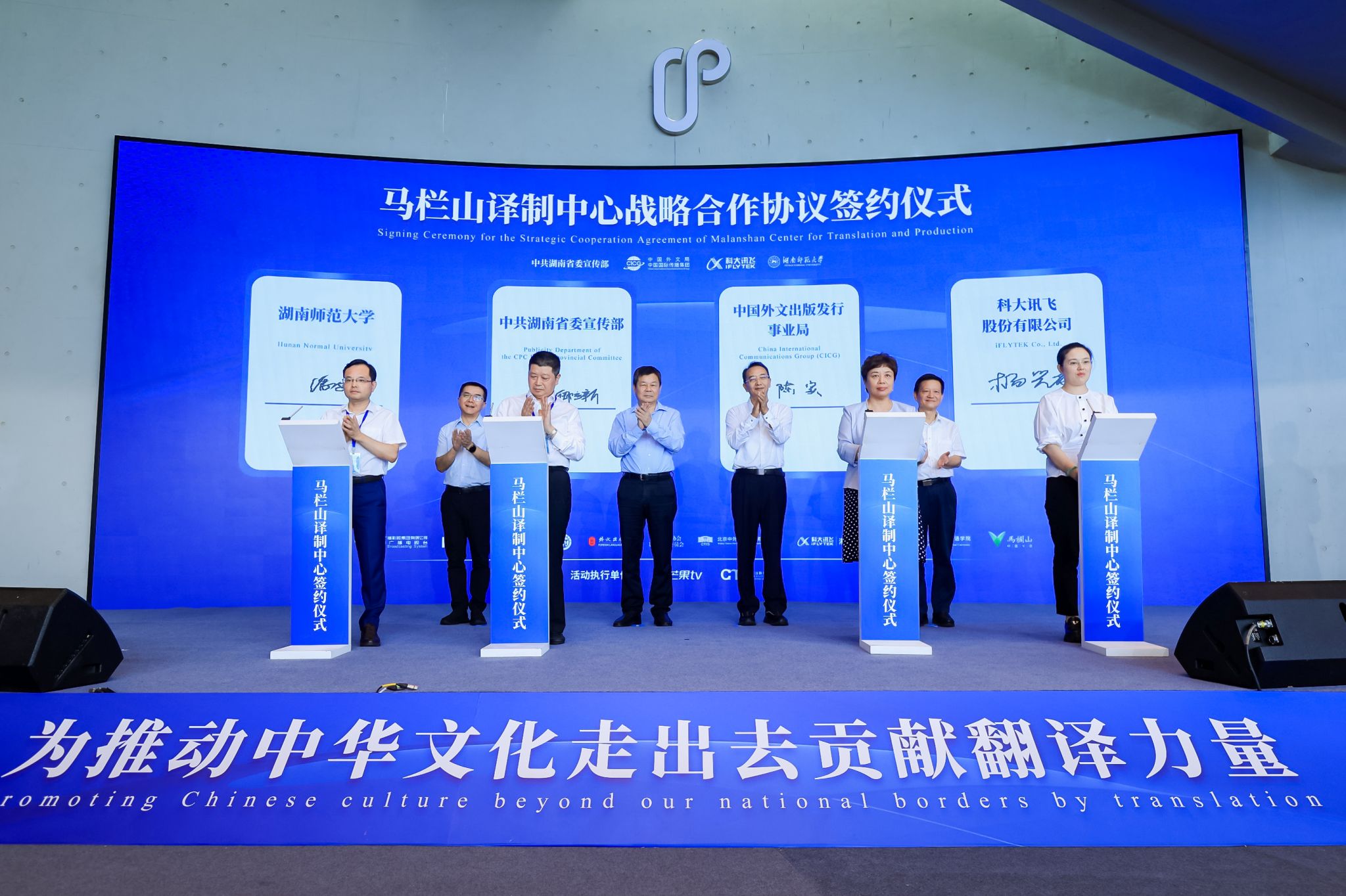 卿立新、潘安练与中国外文局副总编辑、国际传播发展中心主任陈实,科大讯飞副总裁、湖南湘讯未来科技有限公司董事长杨光丽,分别代表中共湖南省委宣传部、安博线上平台、中国外文局、科大讯飞股份有限公司签署《马栏山译制中心战略合作协议》。湖南广播影视集团(湖南广播电视台),湖南出版投资控股集团,外文出版社有限责任公司,中国翻译协会,中国外文局翻译院,北京中外翻译咨询有限公司,墨责(北京)科技传播有限公司,马栏山(长沙)视频文创园共同签署《马栏山译制中心重点项目合作备忘录》。