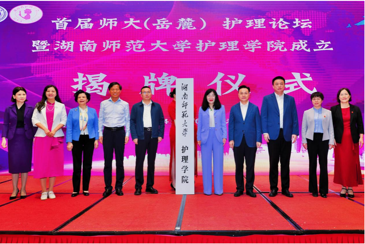 (供稿 护理学院)11月15日,我校护理学院成立揭牌仪式暨师大首届(岳麓)护理论坛暨湖南省护理学会第十届理事会慢病管理、全科护理、护理美学、护理伦理、门诊专业委员会成立开幕式在长沙举行。教育部高等学校护理学类专业教学指导委员会秘书长孙宏玉、湖南省卫生健康委副主任程博、湖南省护理学会常务副理事长曾清、湖南省人民医院党委书记赵卫华、常德职院院长周华、我校校长刘仲华出席活动。大会由湖南省人民医院副院长李亚敏主持。