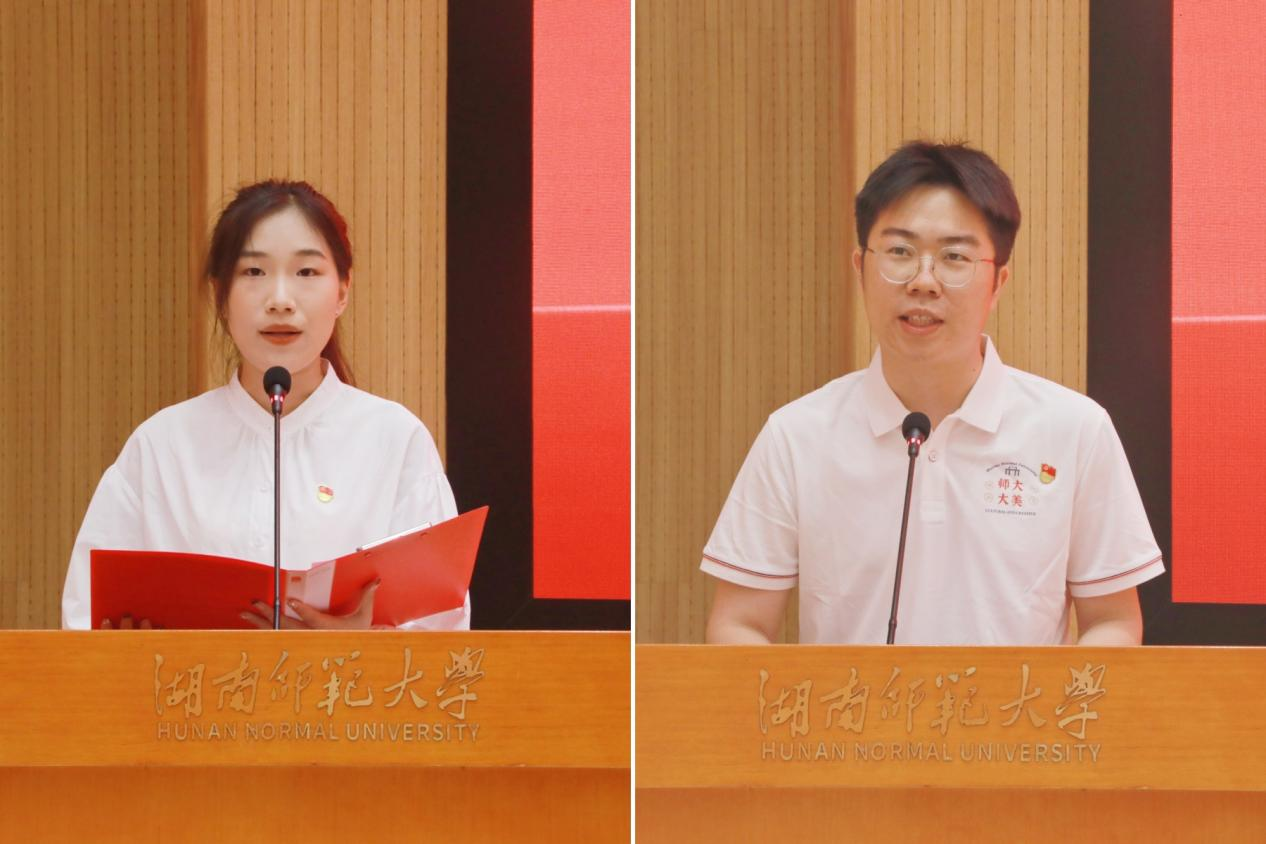 物理与电子科学学院物理学(师范)本科生崔嘉熙、文学院学科教学(语文)硕士研究生邓郭欢作为优秀毕业生党员代表发言。他们回顾了求学期间学习生活工作的历程,讲述了作为一名大学生党员的初心和理想。他们表示,将永远牢记入党初心,踔厉奋发、笃行不怠,在全面建设社会主义现代化国家的新征程上书写属于师大青年的华丽篇章。