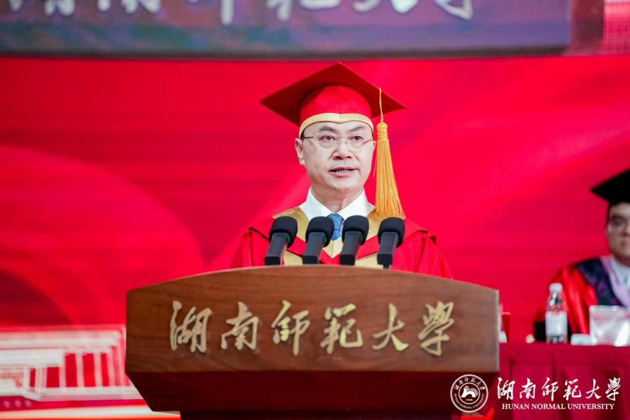刘仲华校长讲话。他代表学校向圆满完成学业的2025届全体本科毕业生致以热烈祝贺,向所有关心、支持和帮助同学们成长成才的教职员工、亲友、校友和各界人士致以衷心感谢。他深情回顾了同学们在湖南师大与时代同频共振的成长轨迹。他强调,2025届毕业生们以青春为笔、奋斗为墨,共同交出了一份优异答卷。临别之际,他向毕业生们提出三点期望:一是在时代浪潮中找准自我,以“大我”格局担当时代使命,要始终将个人成长与国家发展、民族复兴紧密相连,在时代的浪潮中找准属于自己的航向,勇担时代使命,用青春和热血为国家、为社会贡献力量;二是在开拓创新中超越自我,以“超我”韧劲勇攀事业高峰,做“精勤”不辍的探索者、“创新”不止的实干家,不断改变自我、提升自我、超越自我;三是在磨炼考验中坚守自我,以“真我”姿态书写人生华章,要明辨是非、恪守底线,面临诱惑不动摇、面临挫折不退缩,始终保持定力与从容,守护透亮心灵,以赤诚之心活出无愧于时代的精彩人生。