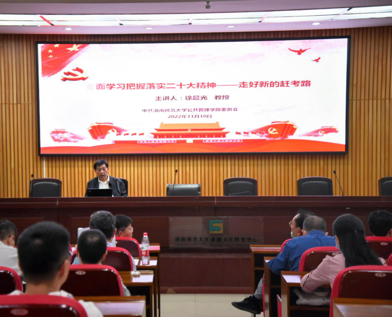 (通讯员 吴乐)近日,一堂以“全面学习把握落实二十大精神——走好新的赶考路”为题的宣讲在公共管理学院举行,知名党建专家、“潇湘学者”、学校党委讲师团成员徐晨光教授同公共管理学院全体教职工和学生党员300余人,通过“线下主会场现场学+线上分会场直播共学”的方式,宣讲党的二十大精神,畅谈新时代青年学生的使命担当。